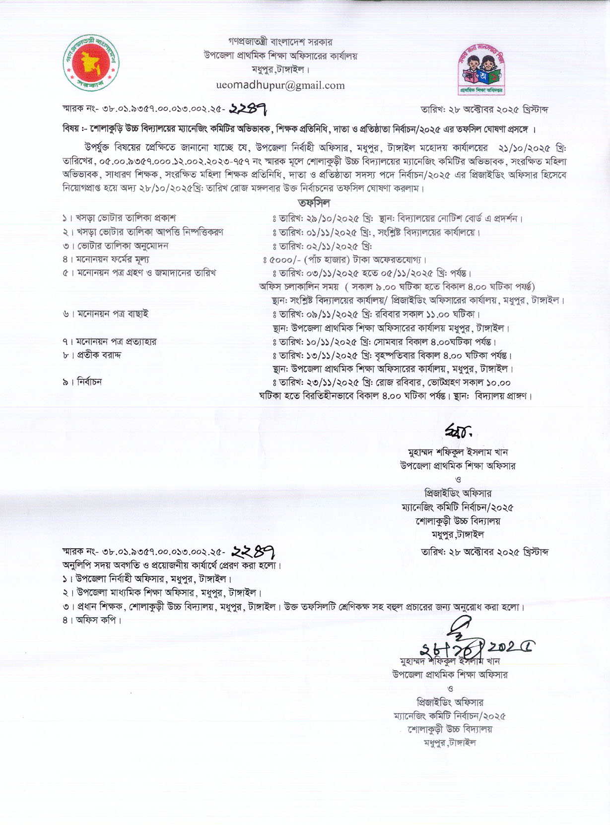 শোলাকুড়ী উচ্চ বিদ্যালয়ের ম্যানেজিং কমিটির অভিভাবক, সংরক্ষিত মহিলা অভিভাবক, সাধাধারণ শিক্ষক, সংরক্ষিত মহিলা শিক্ষক প্রতিনিধি, দাতা ও প্রতিষ্ঠাতা সদস্য পদে নির্বাচন/2025 খ্রি. এর তফসিল